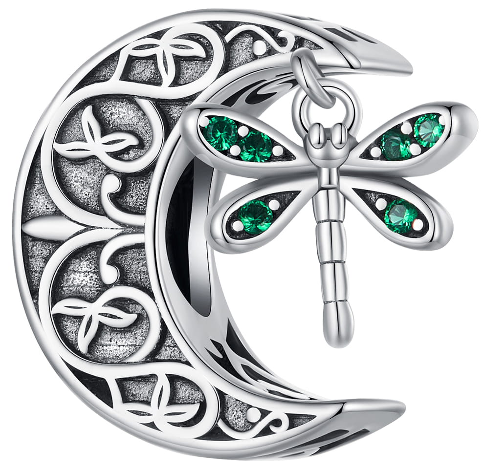 Charms Srebro - Księżycowa Ważka to zawieszka do bransoletek modułowych wykonana ze srebra próby 925. Ma kształt księżyca z wiszącą ważką. Ważka jest ozdobiona cyrkoniami w kolorze zielonym. Ważka to piękne i eleganckie stworzenie, które często kojarzy się z lekkością, wolnością i harmonią. Ważka jest również symbolem przemiany i odrodzenia. Zielony kolor cyrkonii symbolizuje nadzieję, wzrost i nowy początek.