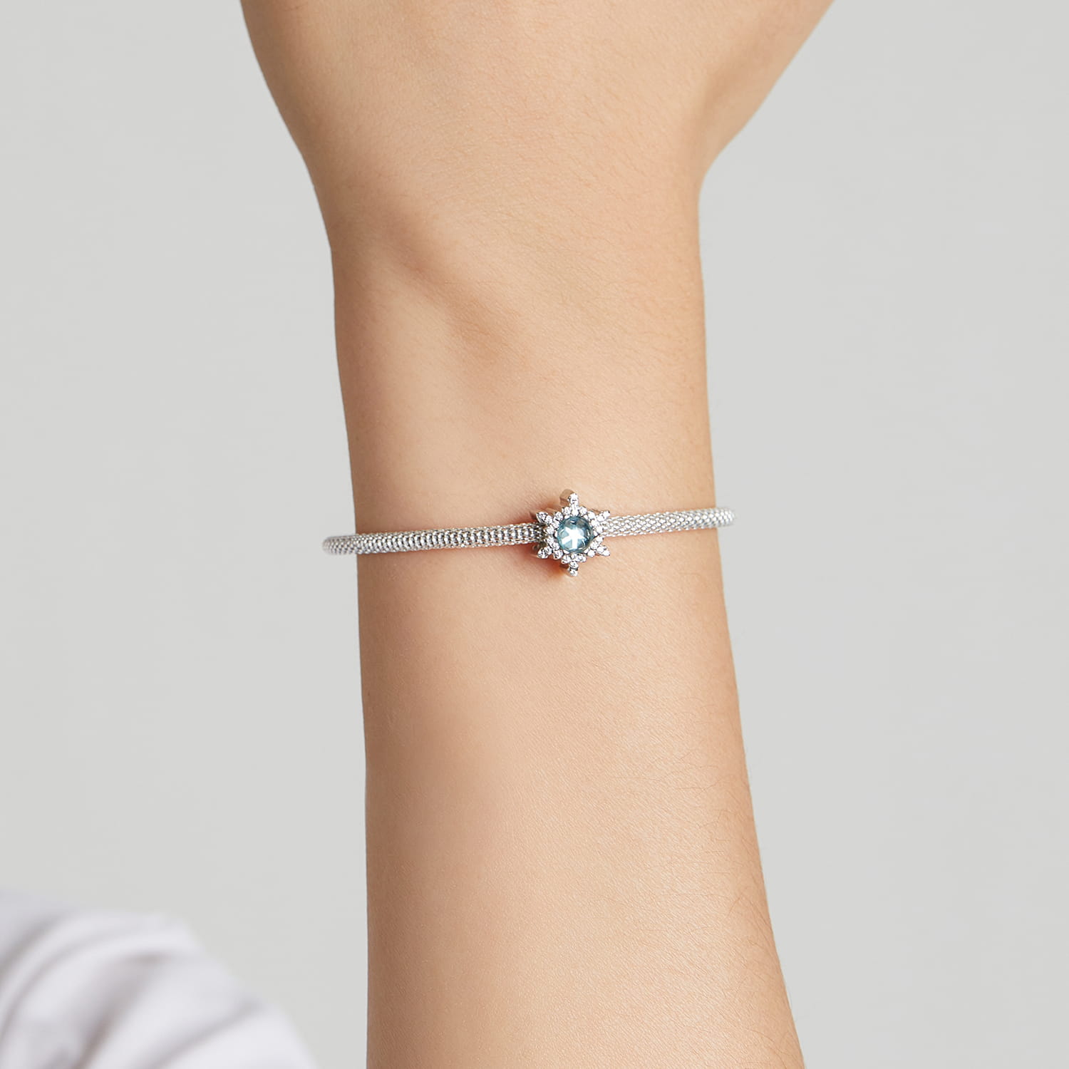 Charms Srebro - Płatek Śniegu Niebieski to srebrny charms zdobiony niebieską cyrkonią, wykonany ze srebra próby 925, ma subtelny, geometryczny wzór w kształcie płatku śniegu. Dzięki niebieskiej cyrkonii na środku tworzy intrygujący efekt blasku. Ten charms można dodawać do istniejących lub nowo tworzonych projektów biżuterii. Jest on idealny do noszenia codziennie lub jako prezent dla bliskich Ci osób.