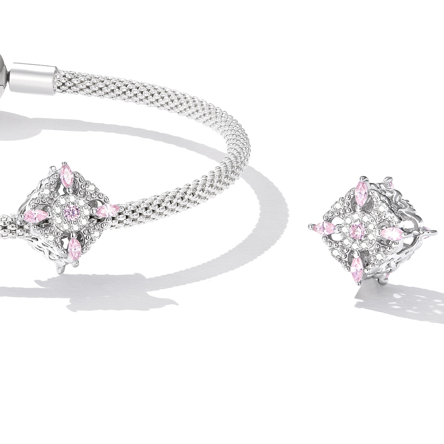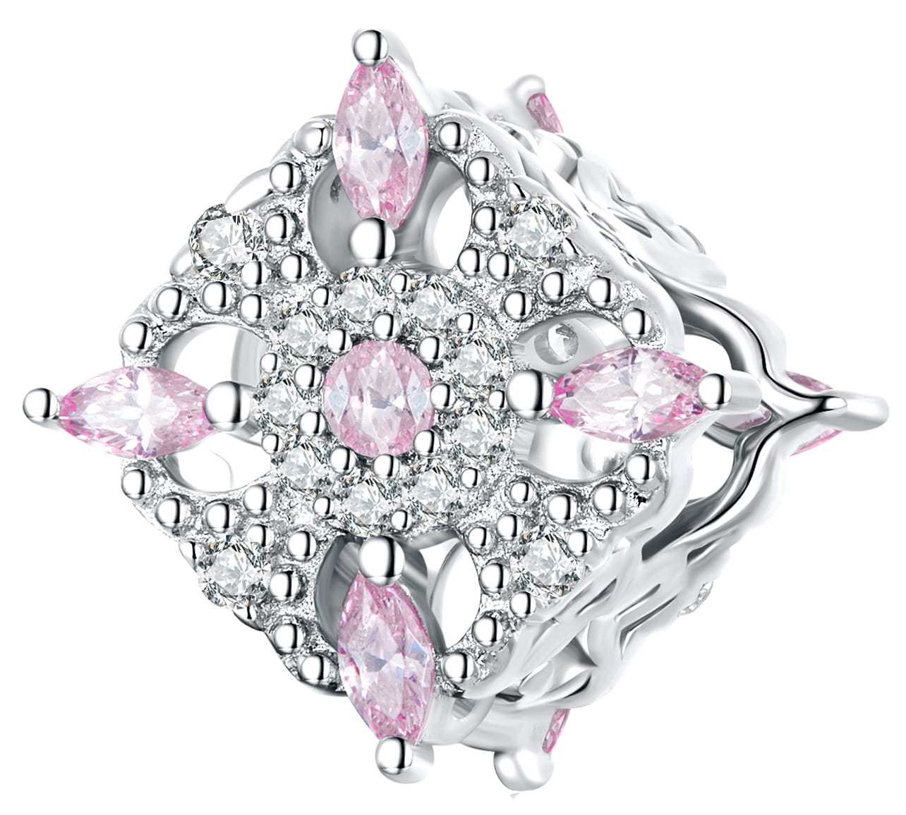 Charms Srebro - Różowe Kamienie to wyjątkowy charms zaprojektowany, aby dodać uroku każdej stylizacji. Jest wykonany ze srebra próby 925 i ozdobiony pięknymi różowymi cyrkoniami. Charms ma kształt kwiatka, co czyni go idealnym elementem do noszenia na swojej bransoletce lub łańcuszku. Wykończony jest delikatnym połyskiem i jest doskonałym dodatkiem do każdego codziennego stroju. Idealy na prezent dla bliskiej osoby lub dla samej siebie.