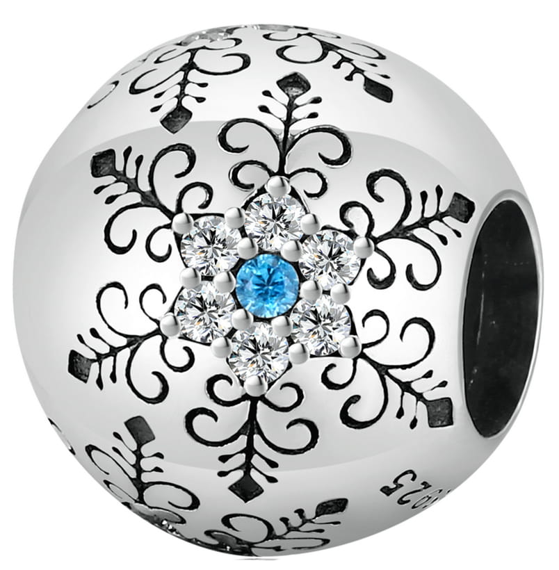 Charms Srebro - Snowflake jest to mała, ażurowa kulka wykonana z srebra próby 925. Na kulce znajdują się wyżłobione i ozdobione jasnymi cyrkoniami motywy płatków śniegu. Charms jest elegancki i subtelny, a jego delikatny blask przyciąga wzrok. Charms może być używany jako samodzielna ozdoba lub może być połączony z innymi charmsami, tworząc unikalną i osobistą kompozycję. Jest to doskonały prezent dla każdej kobiety, która ceni sobie piękno i elegancję.